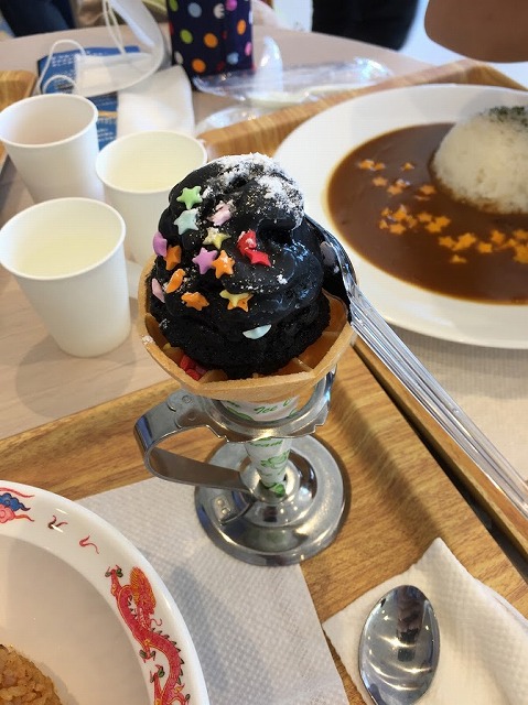 入り口に、高さ1mくらいのソフトクリームの模型が置いてありましたが、色が真っ黒。イカスミソフトでも売ってるのかと思いましたが、その正体は「ブラックバニラ」。宇宙空間をイメージした真っ黒なソフトクリームに、星型のカラフルな砂糖をちりばめたソフトクリームです。